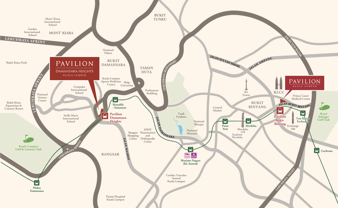 Located within the Pavilion Damansara Heights integrated development, with planned pedestrian connectivity to surrounding retail, offices, and public transport, subject to final design and approvals.